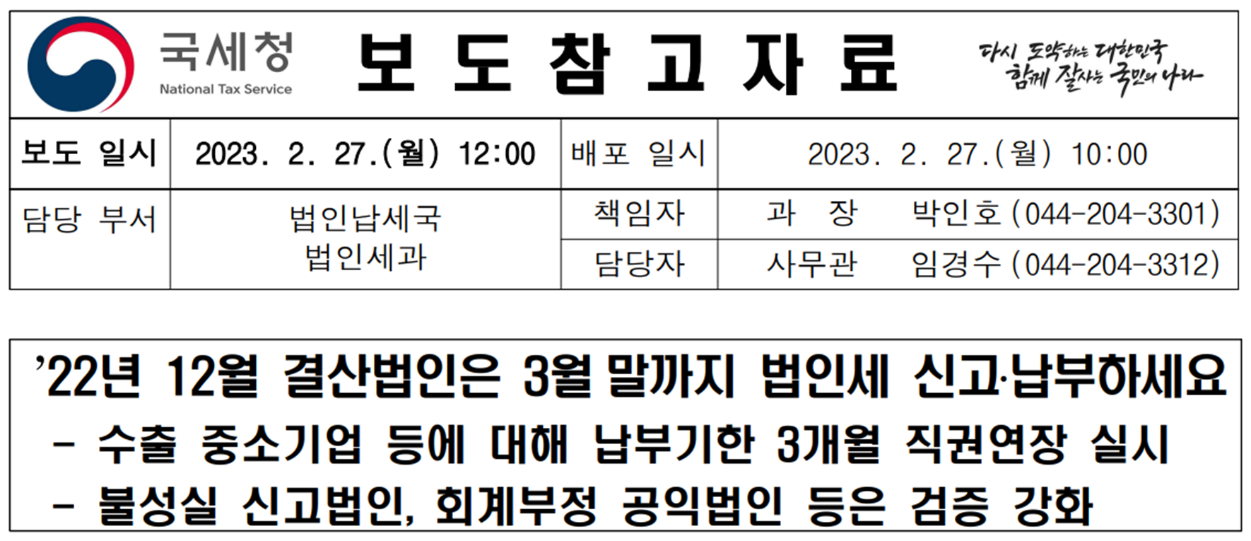 [국세청 보도자료] 법인세 신고 시 참고사항
