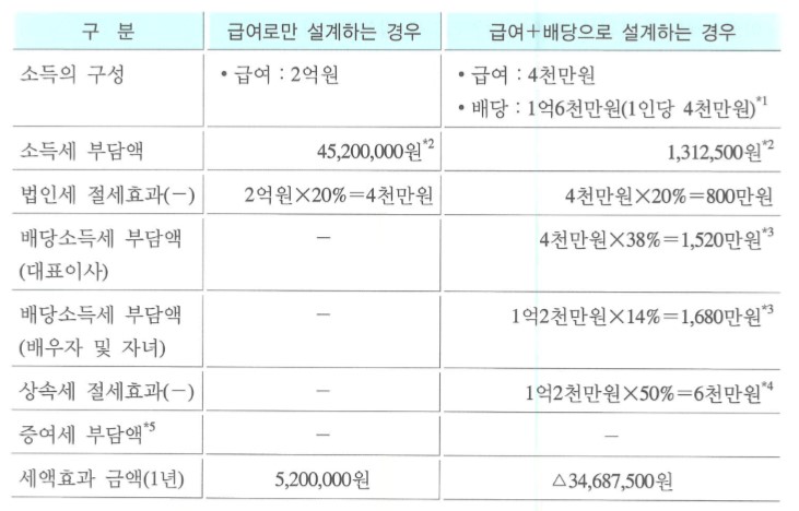 급여만 2억을 받는 경우와 급여 4천만원 + 배당 1억 6천만을 비교하였습니다. 급여만 받는 경우보다 급여+배당을 함께 수령 하는 경우가 궁극적으로 4,000만원 절세효과가 있음을 알 수 있습니다.