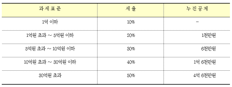 * 조세특례제한법 제30조의5 또는 동법 제30조의6에서 규정하는 창업자금 또는 가업승계증여특례에 해당하는 경우는 30억원 한도 내에서 10% 특례세율이 적용됩니다. 단, 창업자금과 가업승계 주식 등의 증여세 과세특례는 중복적용 되지 않습니다.