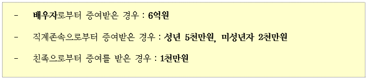 * 10년동안 증여 받은 다음의 금액은 증여세를 부과하지 않습니다.