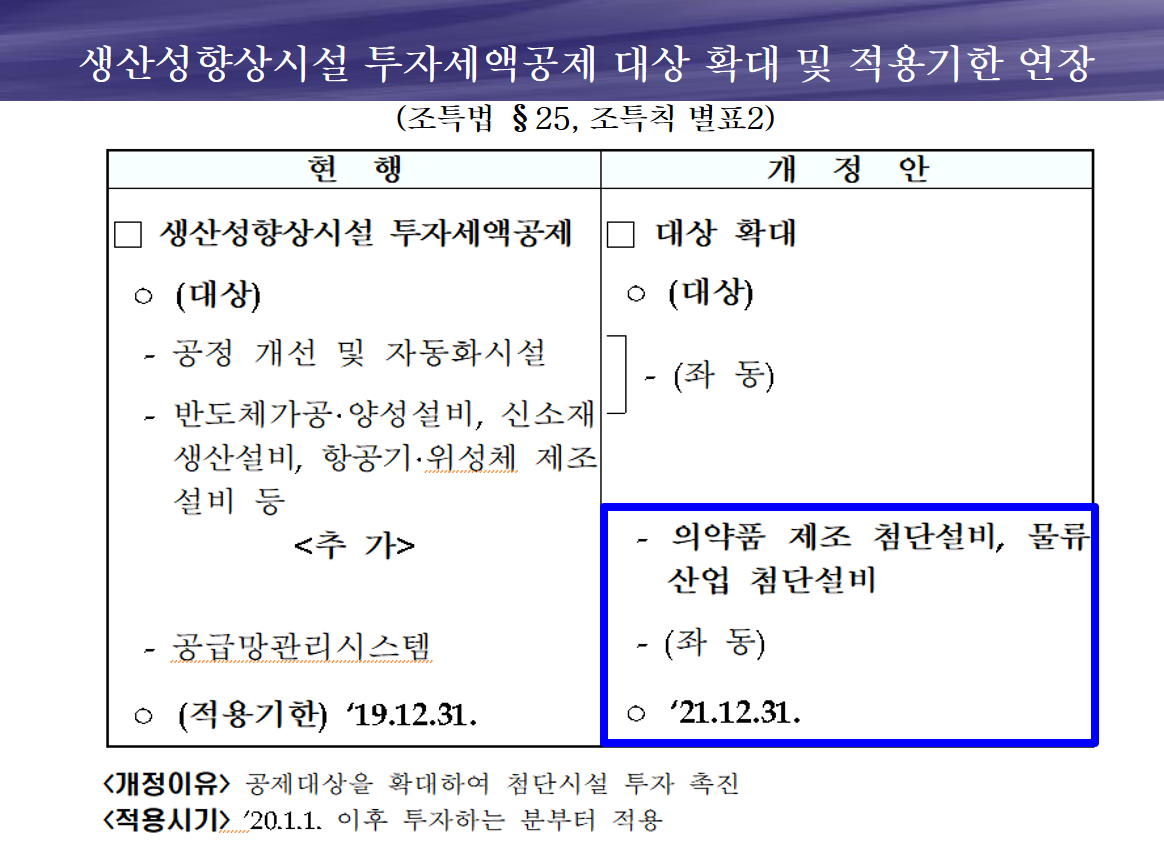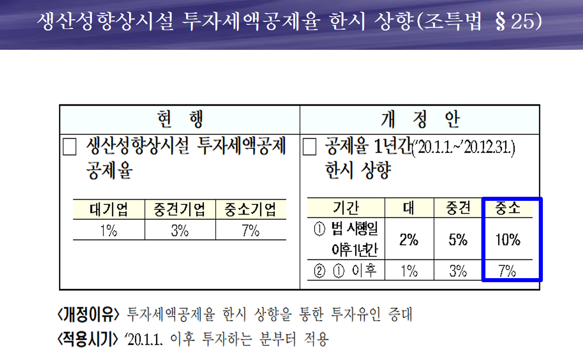 ※ 공장자동화 기계장치와 같은 생산성 향상시설을 도입 및 투자하는 경우, 2020년 1년동안 한시적으로 투자금액의 10%를 법인세 세액공제 해줍니다.