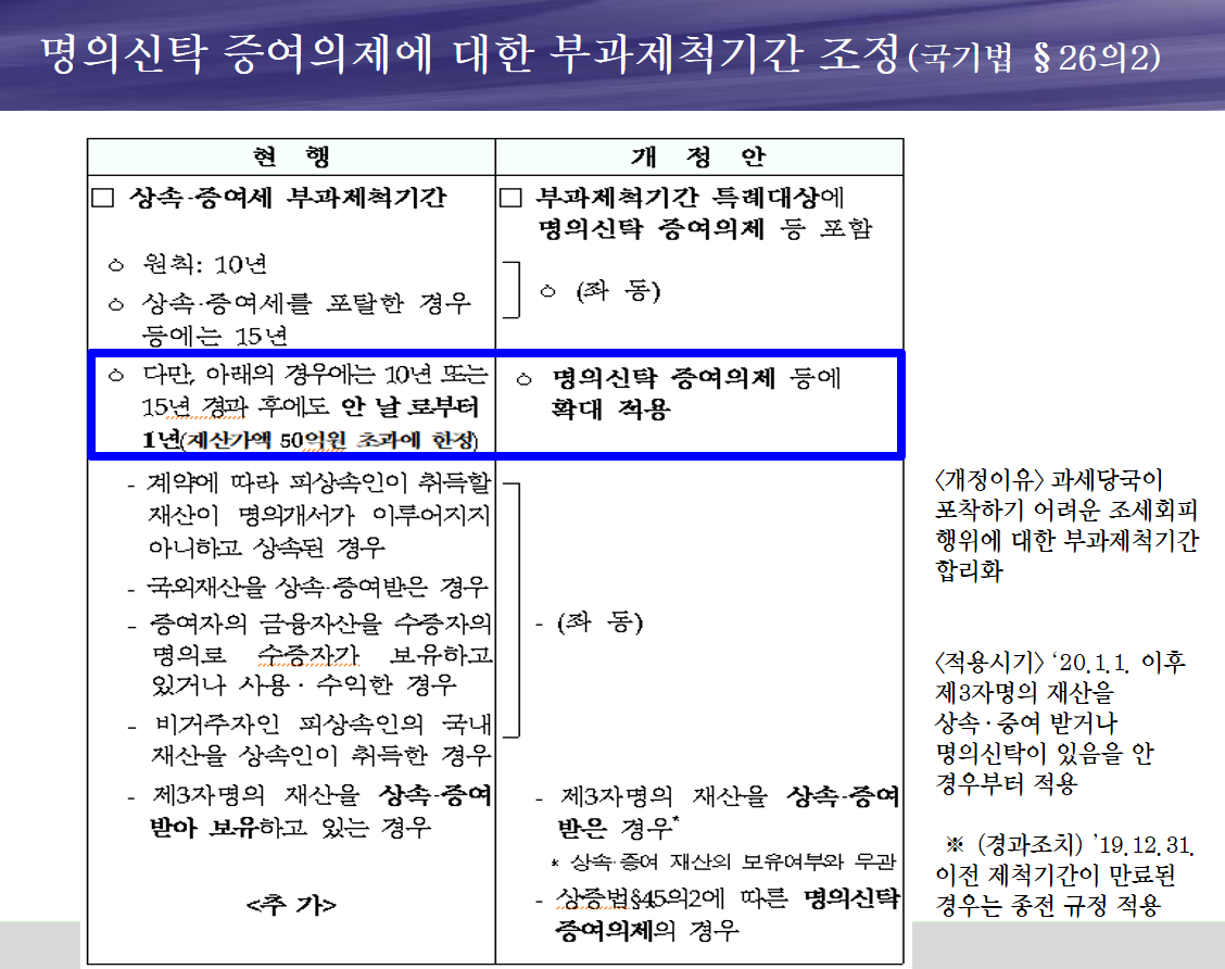 ※ 명의신탁주식의 경우, 15년이 넘는 경우 세금 부과제척기간의 만료(최장 15년)로 커다란 세금 없이 회수가 가능했습니다. 하지만 주식평가금액 50억이 넘는 경우는 불가능하게 되었습니다.