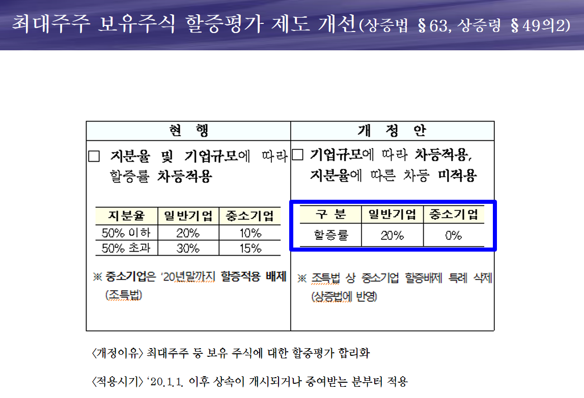 ※ 유명무실했던 최대주주 중소기업 주식 할증평가 항목이 계속 유예되다가, 내년부터 할증평가 항목이 삭제될 예정입니다.