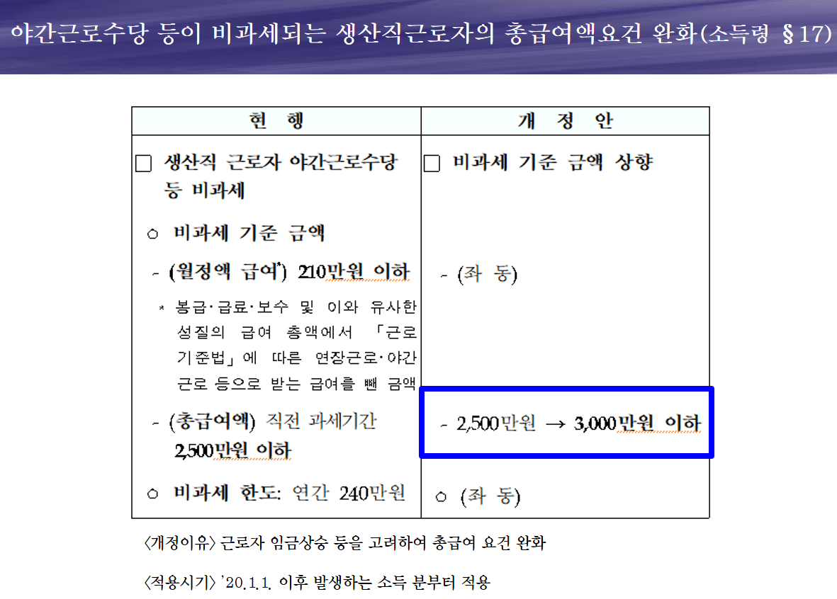 ※ 생산직 근로자의 야간근로수당 비과세 혜택 중 총 급여한도가 높아졌습니다. 단, 월 급여한도는 동일합니다. 급여 중 비과세항목을 챙기는 것은 2가지 효과가 있습니다. 직원의 입장에서는 소득세가 감소하며, 법인의 입장에서는 4대보험료 절감 효과가 있습니다. <중소기업 지원제도> 중 '비과세금여, 알고계십니까?' 글을 참고하시면 도움이 되십니다.