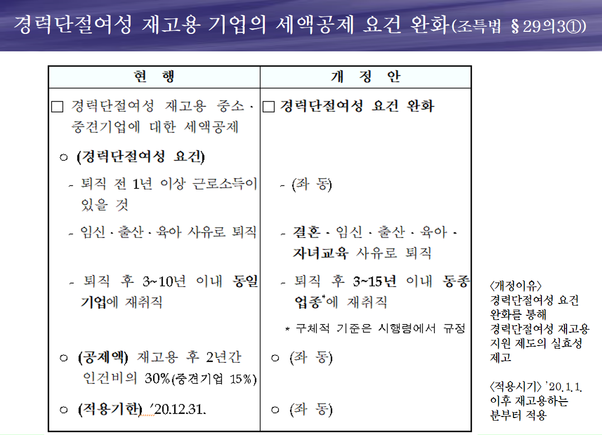 ※ '경력단절여성'을 재고용하는 경우, 채용 후 2년동안 지급하는 인건비의 30%가 법인세 세액공제 됩니다. 대단히 큰 금액이라고 생각합니다. 경력단절여성의 조건이 완화되었습니다. 동일기업에서 동일업종으로!