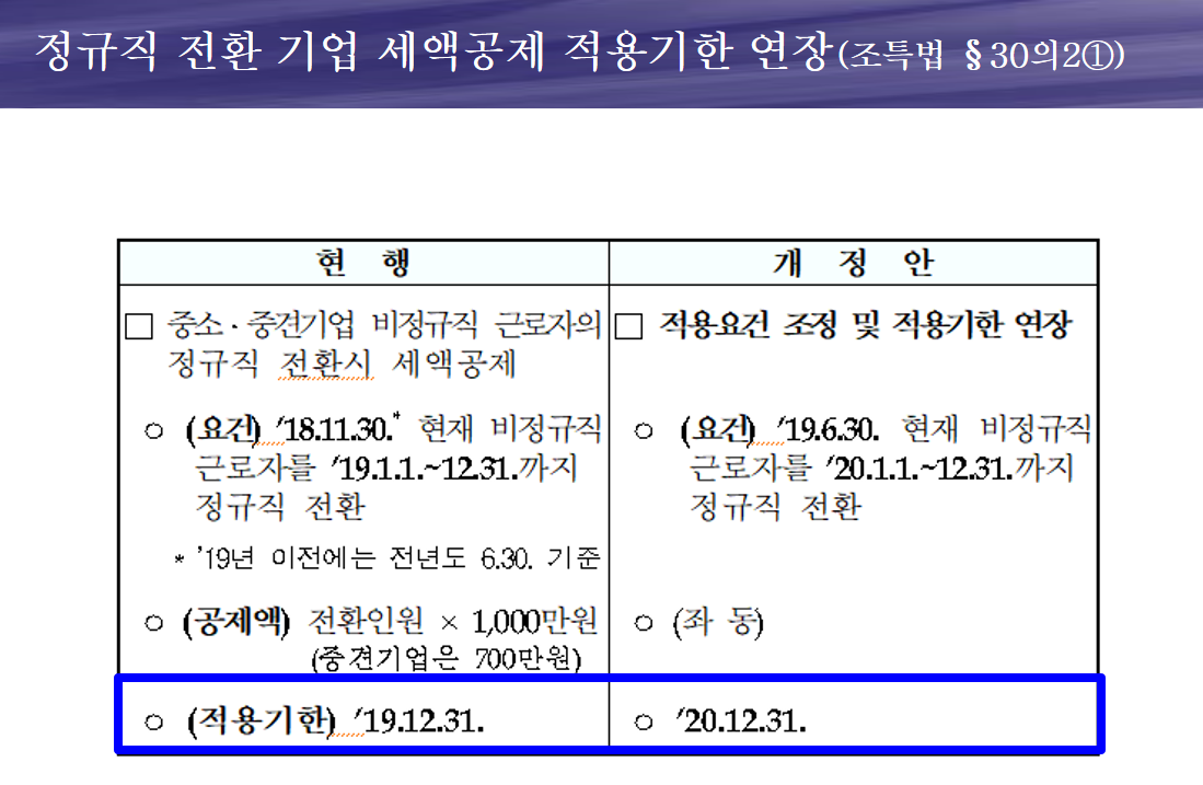 ※ 비정규직을 정규직으로 전환하는 경우, 인당 1,000만원 세액공제 혜택이 있습니다. 이 혜택이 2020년 12월 31일까지 연장되었습니다.
